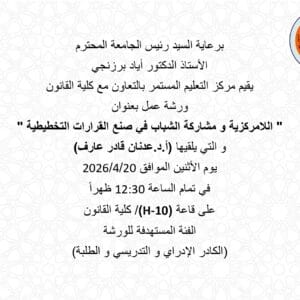 برعاية السيد رئيس الجامعة المحترم الأستاذ الدكتور أياد برزنجي يقيم مركز التعليم المستمر بالتعاون مع شعبة الاعتماد ورشة بعنوان ” أساسيات السلامة في المختبرات ” و التي يلقيها (أ.م.د.سرمد نجم الدين مجيد) يوم الاربعاء الموافق 2026 في تمام الساعة 1:00 ظهراً على قاعة (B-15) بناية كلية الصيدلة، الفئة المستهدفة للورشة هم الطلبة و العاملين في المختبرات .