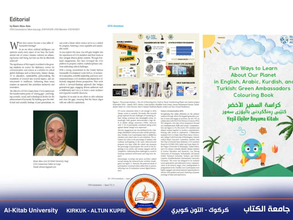 في إنجاز أكاديمي بارز، تولت الدكتورة ريم أبو عاصي، الأستاذة في جامعة الكتاب، رئاسة تحرير العدد الثالث عشر من مجلة Connections الصادرة عن الأكاديمية العالمية للشباب (Global Young Academy)، والذي ناقش موضوع “سد الفجوات – Bridging the Gap” من زوايا متعددة شملت تطوير أساليب التعليم، مفاهيم الاستدامة، تطبيقات الذكاء الاصطناعي، التعاونات العلمية بين التخصصات، بالإضافة إلى السياسات والتشريعات البيئية ذات الصلة.