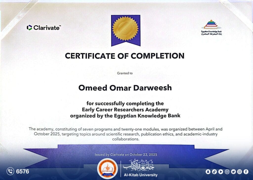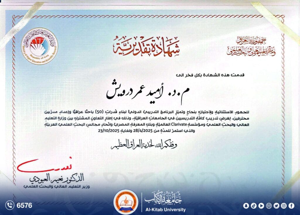 وقد أُقيمت الدورة بإشراف مباشر من دائرة البحث والتطوير في وزارة التعليم العالي والبحث العلمي، وبالتعاون مع مؤسسة كلاريفيت العالمية، وبنك المعرفة المصري، واتحاد مجالس البحث العلمي العربية، للفترة الممتدة من نيسان حتى تشرين الأول 2025، ضمن مبادرة دولية تهدف إلى إعداد مدربين محترفين في مجال البحث الأكاديمي على المستوى الإقليمي.