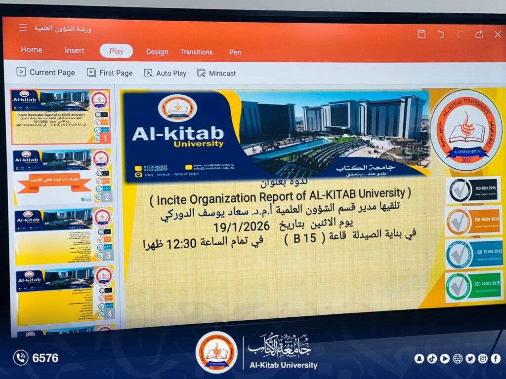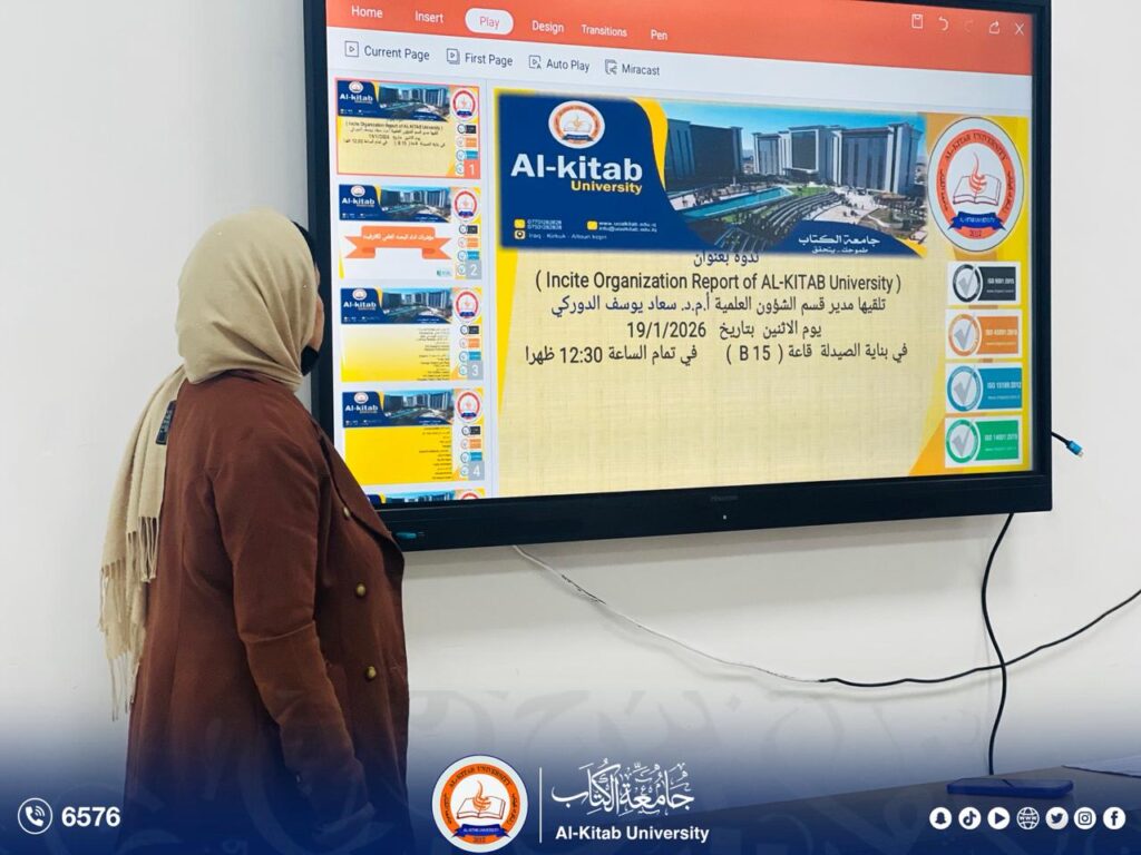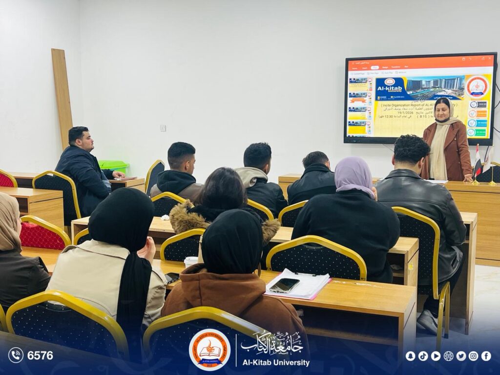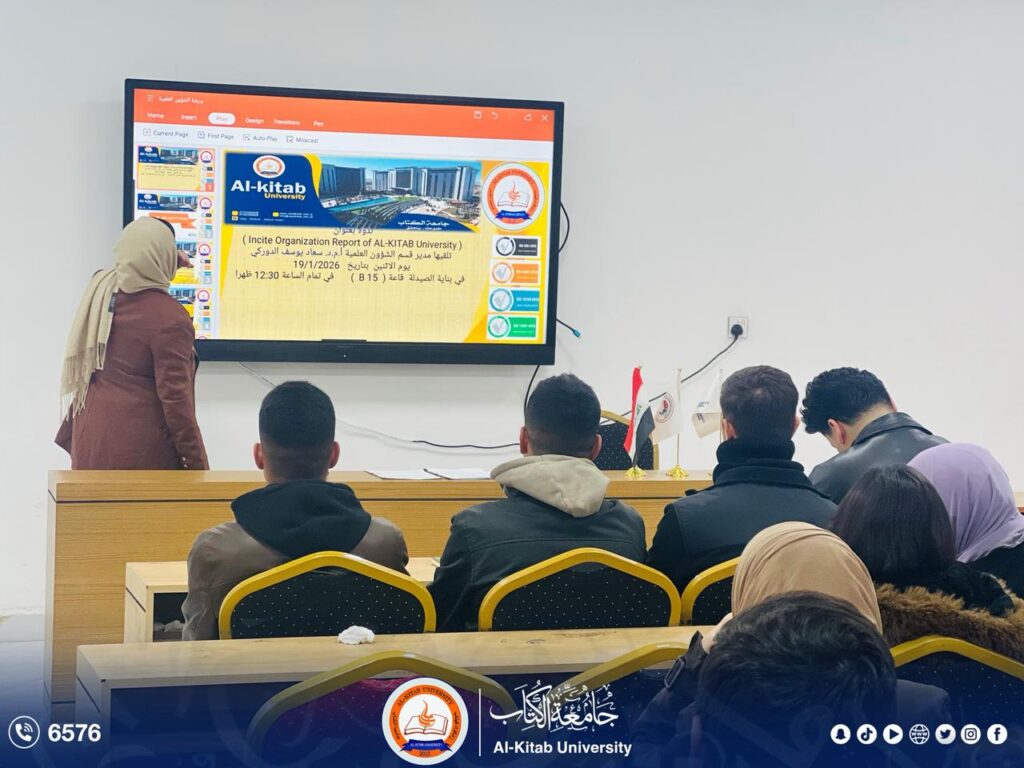 “Incite Organization Report of AL-Kitab University”، وذلك بحضور عدد من أساتذة وطلبة الجامعة، ضمن سعي الجامعة إلى تعزيز الوعي البحثي وتطوير القدرات العلمية والأكاديمية.
