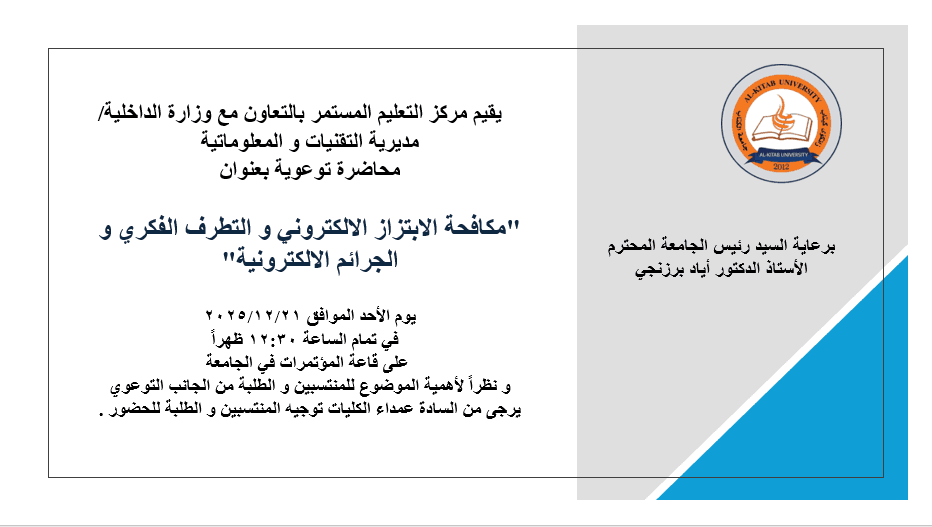 Combating electronic blackmail, intellectual extremism, and cybercrime.+ Add to Google Calendar DateDec 21 2025منتهية Time 12:30 PM - 2:00 PM الموقعAl-Kitab University Conference Hall المنظم Ministry of Interior / Directorate of Technical and InformaticsShare this event