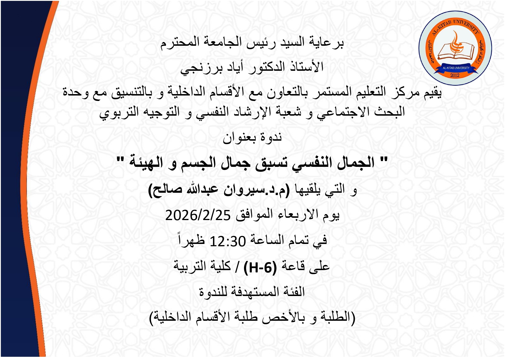 Under the patronage of the respected University President, Professor Dr. Ayad Barznchy, the Continuing Education Center, in cooperation with Dormitories – Social Research Unit and Psychological Counseling and Educational Guidance Division, is organizing a seminar titled “ Psychological beauty precedes the beauty of the body and appearance ” ,The seminar will be delivered by Dr.Sirwan Abdullah Saleh on Wednesday, February 25, 2026, at 12:30 PM in  (H-6) ,college of Education building . The seminar targets are Students, especially those in dormitories .