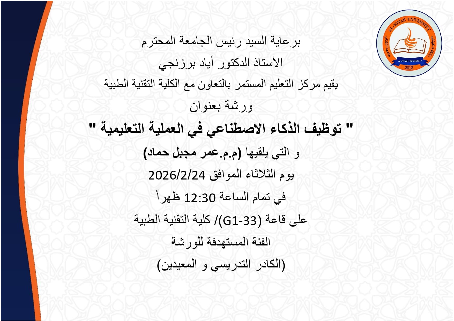 Under the patronage of the respected University President, Professor Dr. Ayad Barznchy, the Continuing Education Center, in cooperation with College of Medical Technology, is organizing a workshop titled The employment of artificial intelligence in the educational process ” ,The workshop will be delivered by Asst. Lect. Omar Mujbil Hammad on Tuesday, February 24, 2026, at 12:30 PM in (G1-33) ,college of Medical Technology Building. The workshop targets are Academic Staff and teaching assistants .