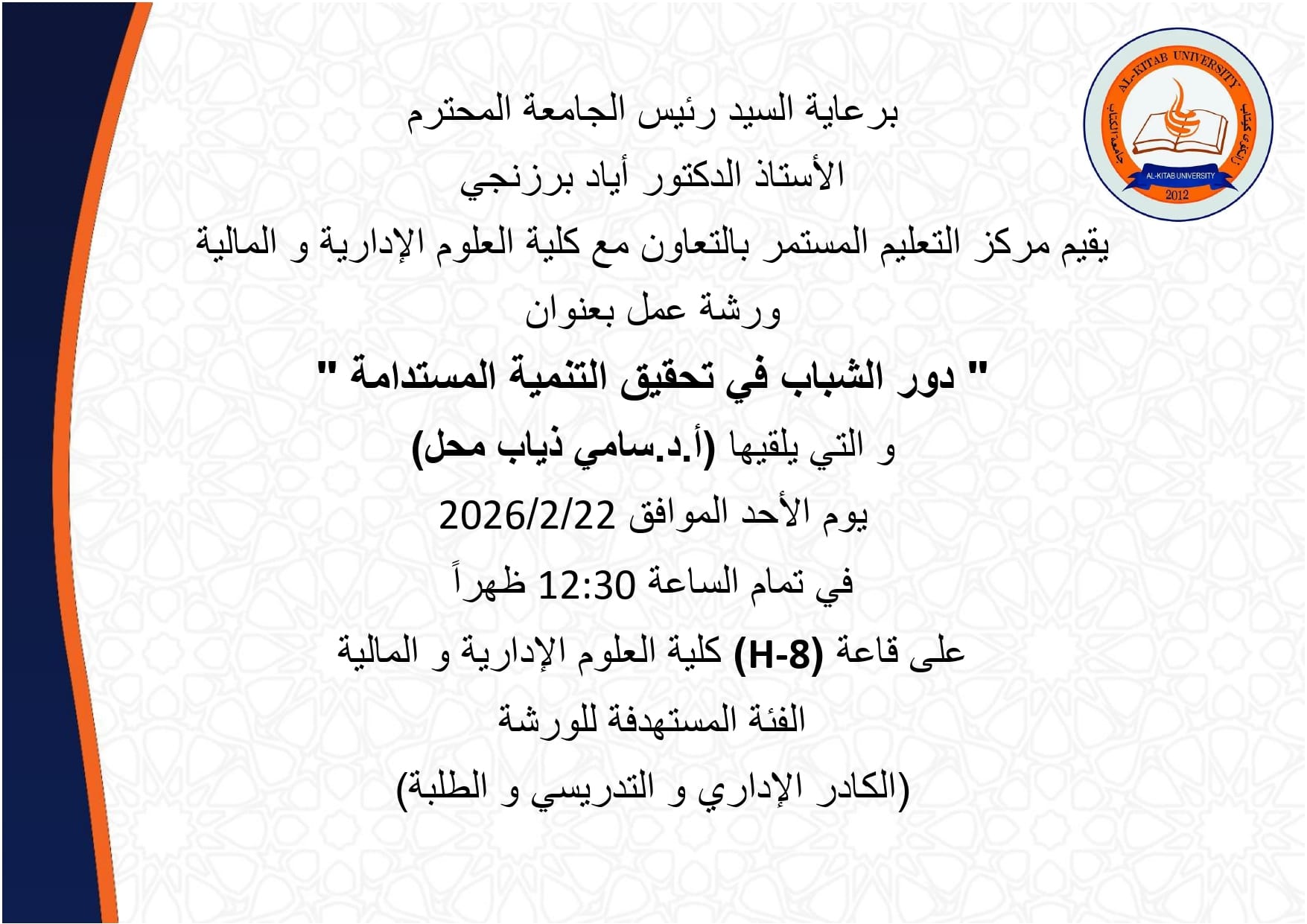 Under the patronage of the respected University President, Professor Dr. Ayad Barznchy, the Continuing Education Center, in cooperation with College of Administrative and Financial Sciences, is organizing a workshop titled “ The role of youth in achieving sustainable development ” ,The workshop will be delivered by Dr.Sami Dhiyab Mahal on Sunday, February 22, 2026, at 12:30 PM in (H–8) ,college of Administrative and Financial Sciences Building. The workshop targets are Administrative and Academic Staff as well as Students .