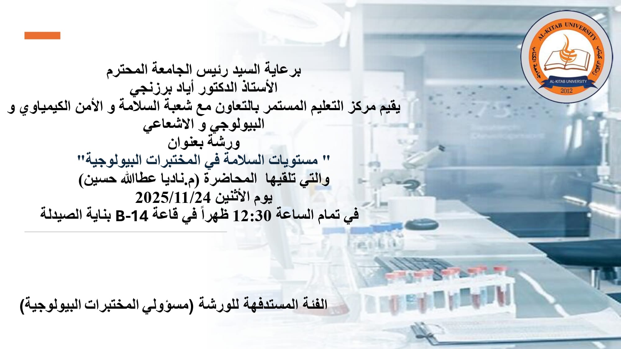 Under the patronage of the respected University President, Professor Dr. Ayad Barznchi, the Center for Continuing Education, in collaboration with the Chemical, Biological, and Radiological Safety and Security Division, is pleased to announce a specialized workshop.